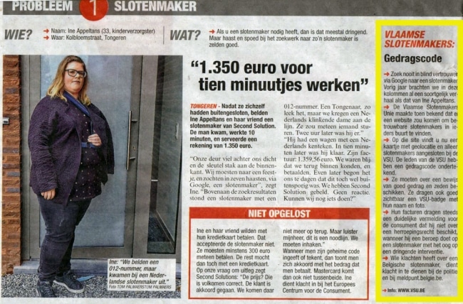 Malafide slotenmakers slaan opnieuw toe in Limburg, zo meldt Het Belang van Limburg. Een dame uit Tongeren sloot zich buiten en keek al snel op Google met haar smartphone voor een slotenmaker. Ze klikte de eerst beste advertentie aan en kwam al snel terecht bij een bedrijf die Second Solution heet. Via het 012-nummer kwamen ze uit bij een Nederlandse slotenmaker en die zouden meteen iemand sturen. Pas na 2 uur arriveerde er een wagen met Nederlands kenteken en tien minuten later was de klus geklaard en werd er een rekening van maar liefst € 1.359,56 gepresenteerd.
