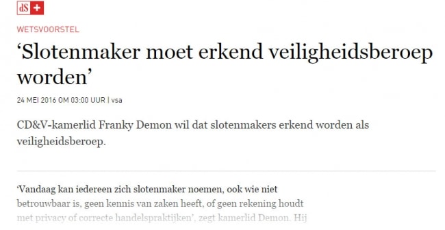 CD&V-kamerlid Franky Demon wil dat slotenmakers erkend worden als veiligheidsberoep. Vandaag kan iedereen zich slotenmaker noemen, ook wie niet betrouwbaar is, geen kennis van zaken heeft, of geen rekening houdt met privacy of correcte handelspraktijken, zegt kamerlid Franky Demon. Hij dient daarom een wetsvoorstel in om van slotenmaker een erkend veiligheidsberoep te maken.